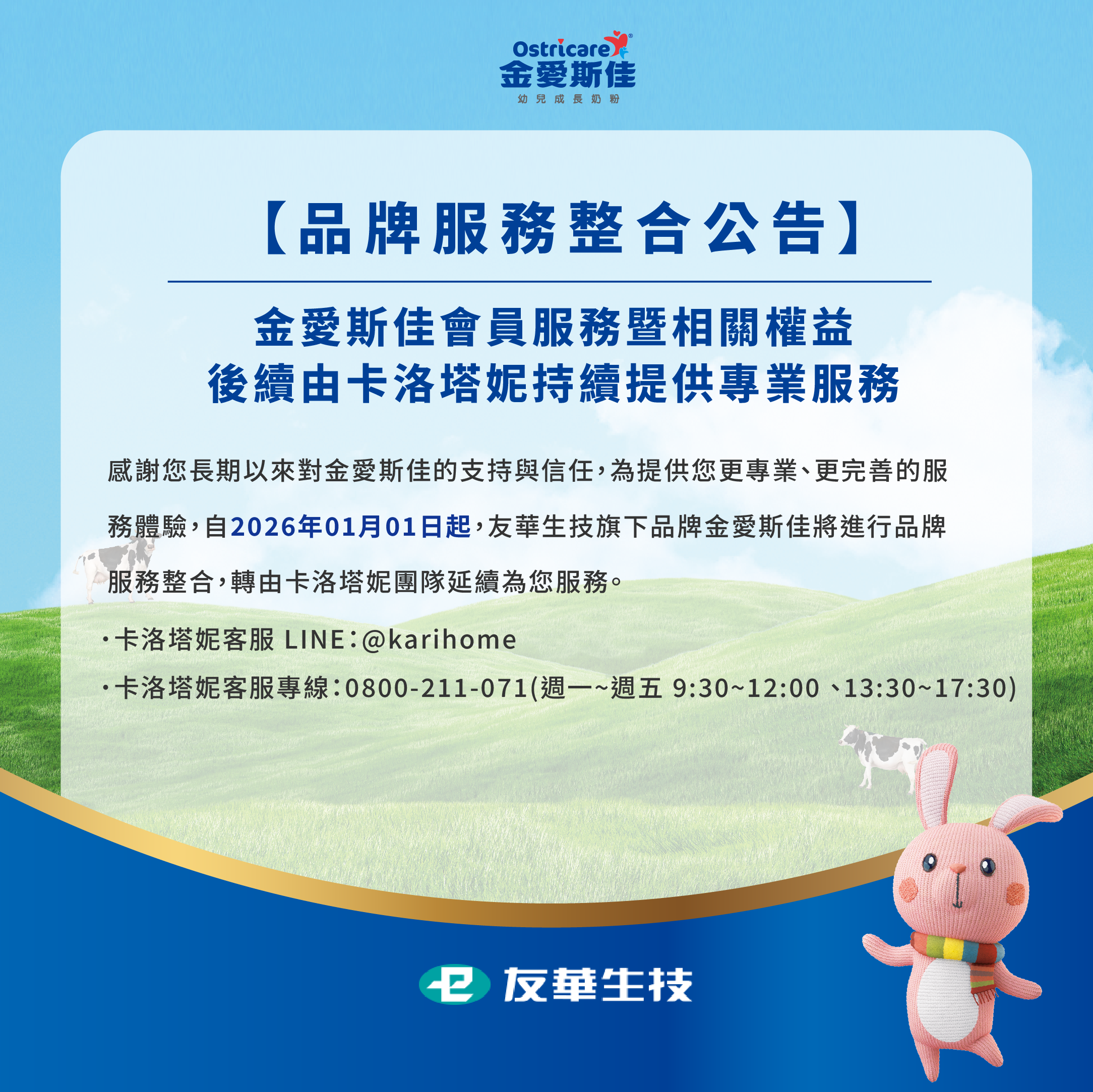 感謝您長期以來對金愛斯佳的支持與信任,為提供您更完整的產品諮詢、完善的服務體驗,自 2026 年 01 月 01 日起,友華生技旗下品牌金愛斯佳將進行品牌服務整合,轉由卡洛塔妮團隊延續為您服務。